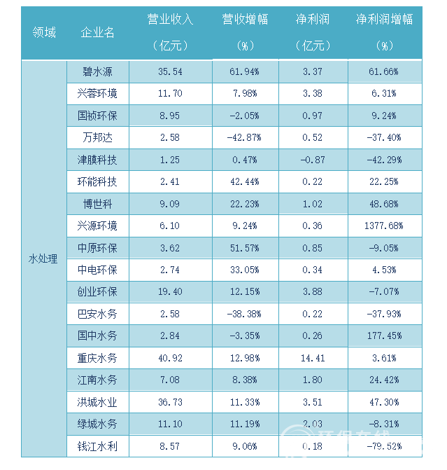 整體來看,18家水處理上市企業(yè)實(shí)現(xiàn)較快增長,其中11家收入和利潤整體實(shí)現(xiàn)雙增長,共計實(shí)現(xiàn)營業(yè)收入213.2億元,凈利潤36.45億元。只有4家企業(yè)營收出現(xiàn)同比下滑,碧水源、環(huán)能科技、中原環(huán)保收入增幅則達(dá)61.94%、42.44%及51.57%。具體如下圖所示:
