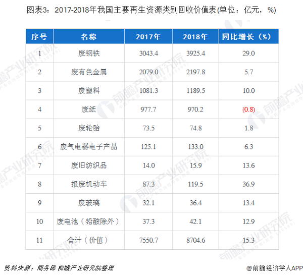 2018年,我國十大品種再生資源回收總值為8704.6億元,同比增長15.3%,除廢紙回收價值有所下降外,其余再生資源品種回收價值均有增長。其中,報廢機動車增幅最高,同比增長36.9%;廢輪胎增幅相對最小,僅同比增長1.8%。