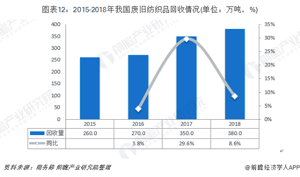 2018年,我國廢舊紡織品回收量約為380萬噸,同比增長8.6%。我國舊衣物回收渠道包括回收箱、線上回收、上門回收、銷售網(wǎng)點代收等,已覆蓋全國大中城市。舊衣物回收企業(yè)也多管齊下,采取多種回收渠道并舉的方式。