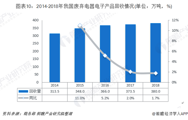 2019年,廢棄電器電子產品回收利用行業(yè)處于政策調整期,新目錄產品配套政策有待出臺,已有產品處理補貼額度將面臨調整。企業(yè)自有回收渠道回收數(shù)量較低,應持續(xù)推進電器電子產品線上+線下、逆向物流等回收模式。“互聯(lián)網(wǎng)+回收”、兩網(wǎng)協(xié)同回收、逆向物流回收等新型回收模式出現(xiàn)。