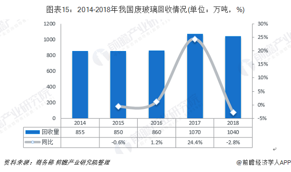 2018年我國廢玻璃回收量為1040萬噸,同比下降2.8%。其中平板玻璃及制品廢玻璃回收利用量為560萬噸,占總回收利用量的53.8%;日用玻璃及制品廢玻璃回收利用量300萬噸,占總回收利用量的28.8%;其他玻璃及制品廢玻璃回收利用量為180萬噸,占總回收利用量的17.4%。
