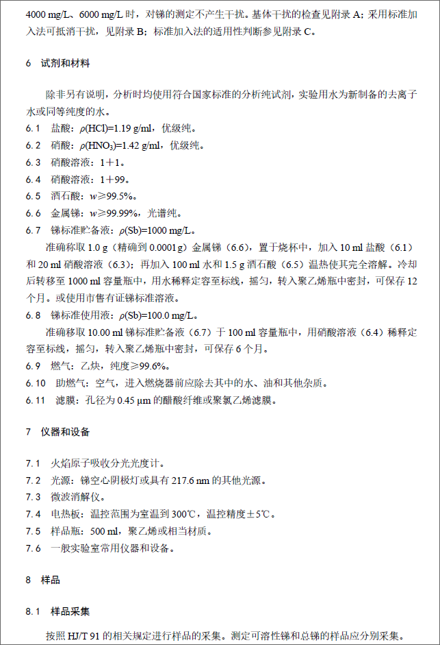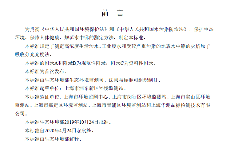 為貫徹《中華人民共和國(guó)環(huán)境保護(hù)法》和《中華人民共和國(guó)水污染防治法》,保護(hù)生態(tài) 環(huán)境,保障人體健康,規(guī)范水中銻的測(cè)定方法,制定本標(biāo)準(zhǔn)。本標(biāo)準(zhǔn)規(guī)定了測(cè)定高濃度生活污水、工業(yè)廢水和受較嚴(yán)重污染的地表水中銻的火焰原子吸收分光光度法。本標(biāo)準(zhǔn)的附錄A和附錄B為規(guī)范性附錄,附錄C為資料性附錄。本標(biāo)準(zhǔn)為首次發(fā)布。