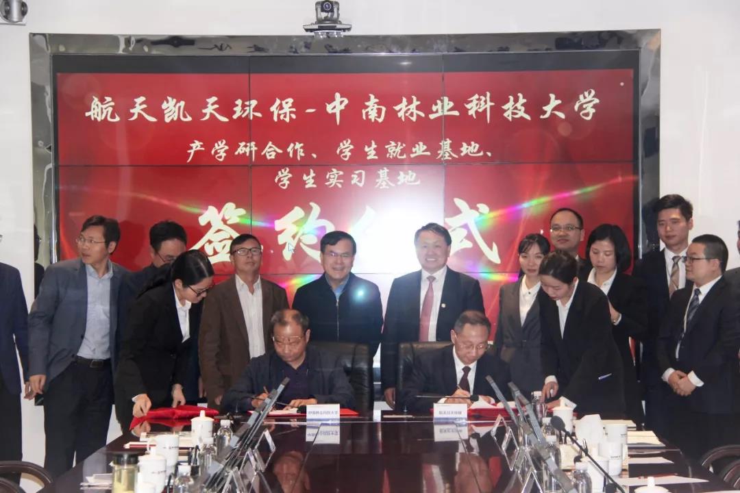 2019年11月6日,航天凱天環(huán)??萍脊煞萦邢薰九c中南林業(yè)科技大學(xué)在航天凱天工業(yè)園內(nèi)成功簽訂產(chǎn)學(xué)研合作協(xié)議,學(xué)生就業(yè)、實(shí)習(xí)基地協(xié)議。中南林業(yè)科技大學(xué)黨委書(shū)記王漢青、環(huán)境科學(xué)與工程學(xué)院院長(zhǎng)王平、科技處副處長(zhǎng)付紅軍等,航天凱天環(huán)??偛萌~明強(qiáng)、副總裁曾毅夫、總裁助理伍蕓昕等出席簽約儀式,總裁助理葉明強(qiáng)主持會(huì)議。