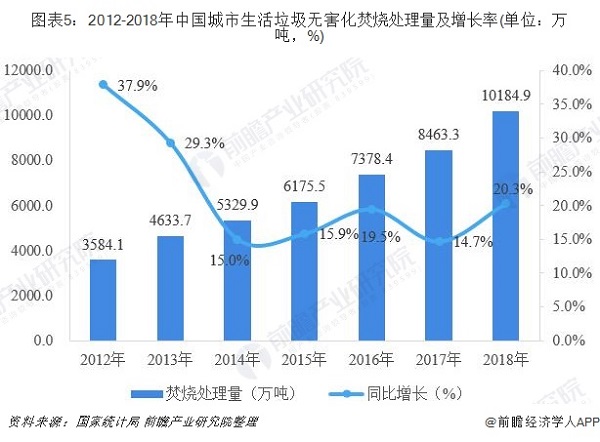 目前我國生活垃圾處理市場增速放緩,整體空間有限,但垃圾焚燒發(fā)電行業(yè)仍處于快速增長的時期,其主要原因在于垃圾處理方式的結(jié)構(gòu)在發(fā)生大的轉(zhuǎn)變,許多填埋處理量將逐漸被焚燒方式所替代。目前,生活垃圾焚燒發(fā)電項(xiàng)目已遍布全國各省、直轄市、自治區(qū),垃圾焚燒發(fā)電項(xiàng)目主要集中在華東、華南地區(qū)。2018年,我國焚燒處理垃圾量為10184.9萬噸,同比增長20.3%,增速明顯高于衛(wèi)生填埋。