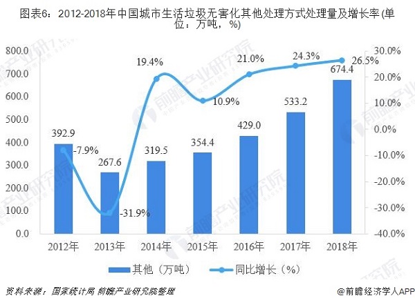 而對于其他技術(shù),其處理量在2012-2013年間呈現(xiàn)下降的趨勢,其后雖有增長,但體量仍較小,主要是因?yàn)槲覈诸愡€很不成熟,而其他技術(shù)主要針對的是易腐有機(jī)質(zhì)含量較高的垃圾,如果垃圾分類沒有發(fā)展好,其他技術(shù)的利用會有很大的局限性。