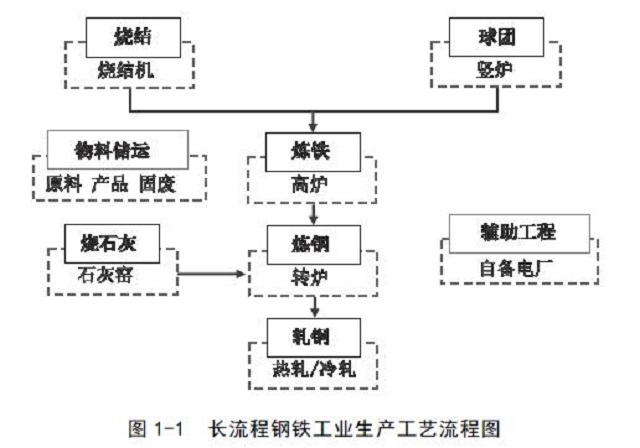 包含聯(lián)合焦化、燒結(jié)、球團、煉鐵、煉鋼、軋鋼、石灰窯、自備電廠等工序的長流程聯(lián)合鋼鐵企業(yè)。