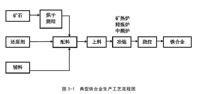 (1)主要生產(chǎn)工藝:原料預處理(烘干、燒結(jié))、配料、冶煉(礦熱爐、精煉爐、中頻電爐)、澆注等。