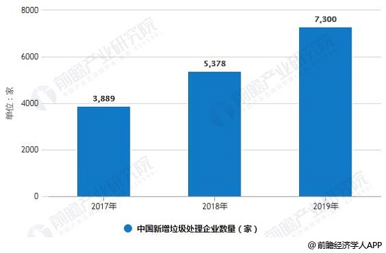 近年來,垃圾處理企業(yè)年增量逐年攀升:2017年、2018年中國新增垃圾處理企業(yè)分別為3889家和5378家,而截至11月18日,2019年新增該類企業(yè)已超過7300家,占總量的26.49%,平均每天就有約23家新企業(yè)出現(xiàn)。