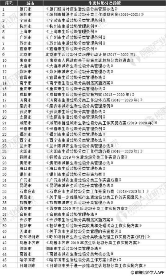 中國46個重點城市垃圾分類名單匯總情況