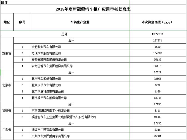 近日,工信部裝備工業(yè)司發(fā)布了《關(guān)于2018年度推廣應(yīng)用新能源汽車(chē)補(bǔ)助資金預(yù)撥審核情況的公示》,具體如下: