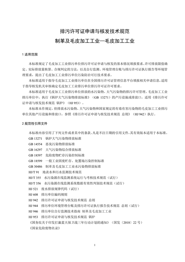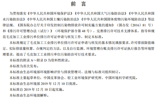 為貫徹落實(shí)《中華人民共和國(guó)環(huán)境保護(hù)法》《中華人民共和國(guó)大氣污染防治法》《中華人民共和國(guó)水污染防治法》《中華人民共和國(guó)土壤污染防治法》《中華人民共和國(guó)固體廢物污染環(huán)境防治法》等法律法規(guī)、《國(guó)務(wù)院辦公廳關(guān)于印發(fā)控制污染物排放許可制實(shí)施方案的通知》(國(guó)辦發(fā)〔2016〕81號(hào))和《排污許可管理辦法(試行)》(環(huán)境保護(hù)部令第48號(hào)),完善排污許可技術(shù)支撐體系,指導(dǎo)和規(guī)范毛皮加工工業(yè)排污單位排污許可證申請(qǐng)與核發(fā)工作,制定本標(biāo)準(zhǔn)。