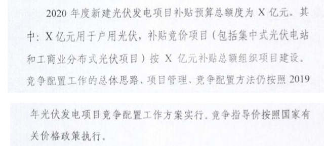 《通知》的一大亮點(diǎn)就是“2020年度新建光伏發(fā)電項(xiàng)目補(bǔ)貼預(yù)算總額度為X億元,其中戶用光伏X億元,競(jìng)價(jià)項(xiàng)目X億元”,這是因?yàn)樨?cái)政部、國(guó)家發(fā)改委價(jià)格司仍未確定2020年光伏補(bǔ)貼總額度以及指導(dǎo)電價(jià),因此負(fù)責(zé)制定管理辦法的國(guó)家能源局也無(wú)法給出明確數(shù)額,指導(dǎo)價(jià)也處于待定狀態(tài)。