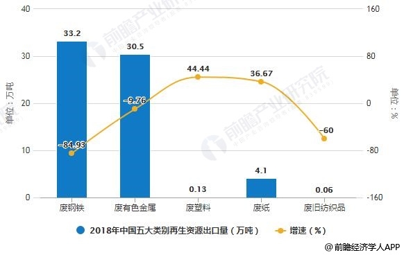2018年中國五大類別再生資源出口量統(tǒng)計及增長情況