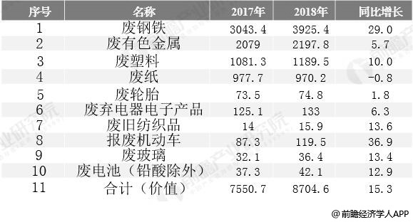 2017-2018年中國再生資源主要類別回收價值統(tǒng)計及增長情況