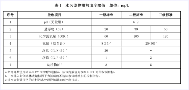 《標(biāo)準(zhǔn)》將PH、懸浮物(SS)、化學(xué)需氧量、氨氮、總氮、總磷和動植物油作為水污染控制指標(biāo)。根據(jù)農(nóng)村污水處理設(shè)施排入地表水的環(huán)境功能和保護(hù)目標(biāo),《標(biāo)準(zhǔn)》將上述項目的標(biāo)準(zhǔn)值分為三類?,F(xiàn)有農(nóng)村生活污水處理設(shè)施水污染物排放應(yīng)于2020年12月25日起執(zhí)行本標(biāo)準(zhǔn)。