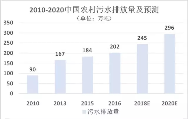 目前,農村水污染物排放量占全國水污染物排放量50%以上,根據前瞻產業(yè)研究院發(fā)布的《2017-2022年中國農村污水處理行業(yè)發(fā)展前景預測與投資戰(zhàn)略規(guī)劃分析報告》顯示:2016年我國農村污水排放量達到202萬噸,2010-2016年復合增速超過10%,預測到2020年可達到近300萬噸,由此可見農村污水排放量體量驚人,我國農村污水處理的市場需求十分劇烈!