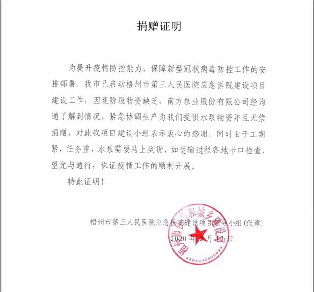 同時,2月中下旬,梧州市啟動第三人民醫(yī)院應急醫(yī)院建設(shè)項目建設(shè)工作,因現(xiàn)階段物資缺乏,南方泵業(yè)股份有限公司經(jīng)溝通了解到情況后,緊急協(xié)調(diào)生產(chǎn)為醫(yī)院提供水泵物資并且無償捐贈,由于工期緊,任務重,南方泵業(yè)積極協(xié)調(diào)生產(chǎn)及運輸,確保物資準時到位,保障醫(yī)院建設(shè)工作,保證疫情工作的順利開展。