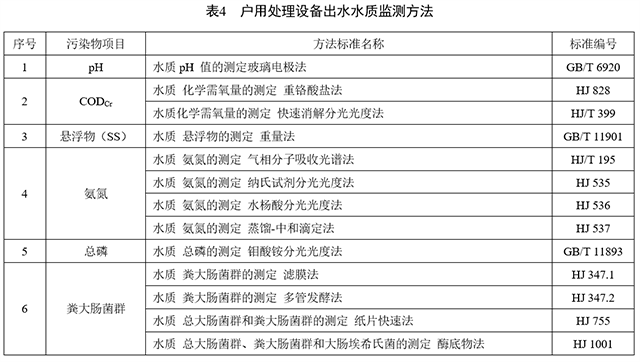 去除率指標僅針對5m3/d(含)以下的集中處理設(shè)施執(zhí)行,當環(huán)境溫度為大于等于12℃、進水濃度大于等于150mg/L時的化學(xué)需氧量(CODcr)去除率。當環(huán)境溫度為≥10℃時,戶用處理設(shè)備的化學(xué)需氧量(CODcr)、氨氮(以N計)的污染物去除率至少要達到化學(xué)需氧量(CODCr)與氨氮(以N計)的去除率均大于等于60%。