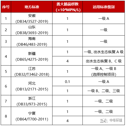農(nóng)村污水處理設(shè)施尾水一般就近進(jìn)入村莊周邊河道坑塘,或用于農(nóng)田灌溉等回用用途。據(jù)不完全統(tǒng)計(jì),在已發(fā)布的31個(gè)省/直轄市的地方農(nóng)村污水處理設(shè)施水污染物排放標(biāo)準(zhǔn)中,僅有8個(gè)地區(qū)的農(nóng)污標(biāo)準(zhǔn)對(duì)出水的衛(wèi)生學(xué)指標(biāo)提出了要求(以糞大腸桿菌群為主,見(jiàn)表1)。在大部分地區(qū)農(nóng)污標(biāo)準(zhǔn)中,除出水回用時(shí)需達(dá)到相應(yīng)的回用標(biāo)準(zhǔn)外(如灌溉),并未對(duì)出水的衛(wèi)生學(xué)指標(biāo)作出單獨(dú)規(guī)定。