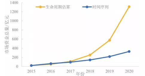 對(duì)于“十三五”期間土壤修復(fù)市場(chǎng)的預(yù)測(cè),利用生命周期估算和時(shí)間序列法進(jìn)行分析。根據(jù)生命周期估算法預(yù)測(cè)在整個(gè)“十三五”期間市場(chǎng)總額約為2297億元,是較為激進(jìn)樂(lè)觀的情況;根據(jù)利用時(shí)間序列法預(yù)測(cè)“十三五”期間市場(chǎng)總額約為849億元,是相對(duì)保守的情況,如圖5所示。