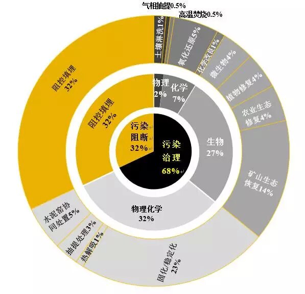 根據(jù)江蘇?。ㄒ伺d)環(huán)保產(chǎn)業(yè)技術(shù)研究院及土盟對(duì)公開(kāi)招投標(biāo)項(xiàng)目的統(tǒng)計(jì)調(diào)查發(fā)現(xiàn),2008-2016年,我國(guó)177個(gè)土壤修復(fù)項(xiàng)目中,土壤修復(fù)以污染介質(zhì)治理技術(shù)為主,占比68%;污染途徑阻斷技術(shù)占比32%。在污染介質(zhì)治理技術(shù)中,物理化學(xué)和生物技術(shù)成為主要技術(shù),分別占比32%和27%;物理、化學(xué)單一類技術(shù)應(yīng)用占比相對(duì)較小,分別為2%和7%(圖 1)。