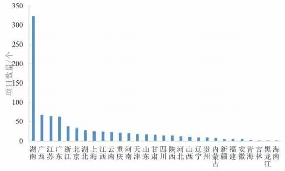 從目前所采集到的數(shù)據(jù)來(lái)看,已有29 個(gè)?。ㄗ灾螀^(qū)、直轄市)發(fā)布過(guò)土壤修復(fù)項(xiàng)目,如圖 4 所示。在發(fā)布項(xiàng)目的數(shù)量上,湖南、廣西、廣東、江蘇、浙江、北京各地較為領(lǐng)先,其中湖南省土壤修復(fù)項(xiàng)目數(shù)量居全國(guó)首位。