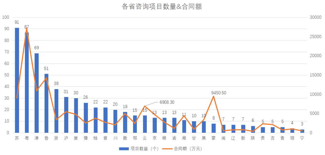 圖2 各省區(qū)市咨詢項目數量與合同額情況