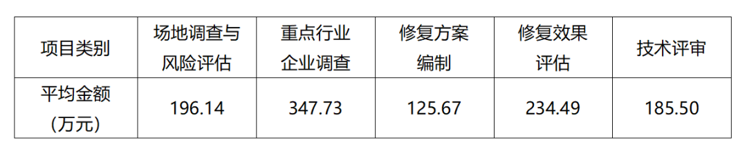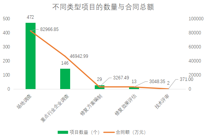 場地調查與風險評估項目(含在產企業(yè)自行監(jiān)測)仍然在2019年項目中占據主流,項目數量占比71.30,%,合同額占比60.74%,但場調這“老大”做得卻不像從前那樣穩(wěn)當。2019年的“明星”是重點行業(yè)企業(yè)調查,全年公開招標146個項目,合同額46942.99萬元,平均347.73萬元,遠超場地調查的196.14萬元,而據行業(yè)內部信息,重點行業(yè)企業(yè)調查的實際規(guī)模差不多是本次搜集數據的3~5倍,其體量可能已超過場地調查與風險評估。