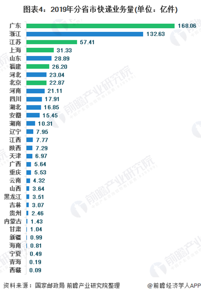 從各省市快遞業(yè)務(wù)量來(lái)看,2019年快遞業(yè)務(wù)量前三省市分別為:廣東(168.06億件)、浙江(132.63億件)、江蘇(57.41億件)。