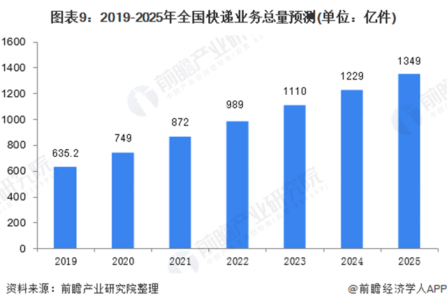 根據(jù)近幾年中國(guó)快遞業(yè)務(wù)量增速測(cè)算,到2025年,中國(guó)快遞業(yè)務(wù)量將達(dá)到1349億件,年復(fù)合增長(zhǎng)率為13.4%。