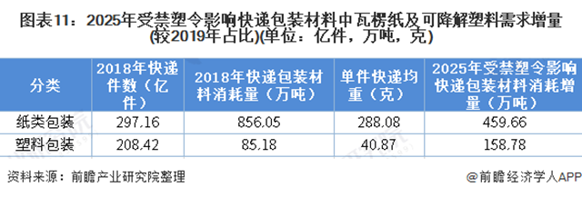 相對(duì)于2019年,受禁塑令影響將導(dǎo)致2025年紙質(zhì)包裝快遞潛在需求增加165.9億件,采用可降解塑料的塑料包裝快遞潛在需求增加388.5億件;2025年,用于快遞包裝的瓦楞紙潛在需求增量為459.66萬(wàn)噸,可降解塑料潛在需求增量為158.78萬(wàn)噸。