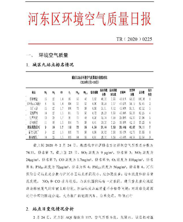 在環(huán)境管理技術(shù)指導(dǎo)過程中,公司堅(jiān)持駐場(chǎng)人員指導(dǎo)服務(wù)+總部大數(shù)據(jù)分析支撐的雙管齊下服務(wù)模式,每日為臨沂市河?xùn)|區(qū)提供環(huán)境空氣質(zhì)量日?qǐng)?bào),提供針對(duì)污染源排查的數(shù)據(jù)分析報(bào)告,如分析2020年春節(jié)前后機(jī)動(dòng)車變化情況對(duì)國(guó)控站點(diǎn)的數(shù)據(jù)影響程度的“春節(jié)效應(yīng)”、“祭祀效應(yīng)”等。