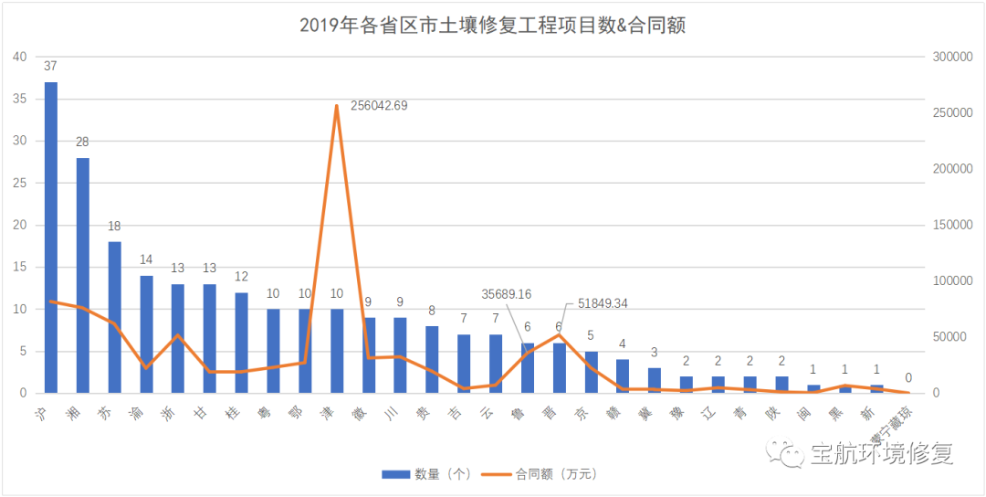 圖2 各省區(qū)市土壤修復工程項目數&合同額