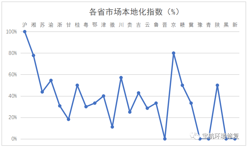 除了污染特征、地方財力等因素外,市場環(huán)境也是我們關注的重點,為此我們提出了一個簡單的“市場本地化指數”,即省外企業(yè)中標項目數量在該省份全部項目中所占的比例。