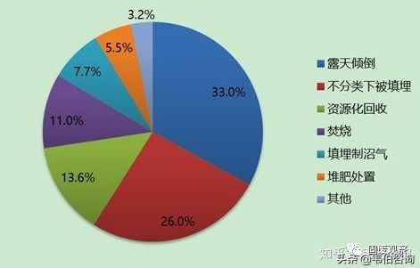 根據(jù)世界銀行報(bào)告,2016年,全球垃圾的末端處置方式有露天傾倒、填埋(不分類(lèi)、沼氣化、控制)、焚燒、堆肥、資源化回收。有33%的垃圾未加處理被露天傾倒,26%的垃圾不分類(lèi)下被填埋掉,7.7%的垃圾填埋制沼氣,11%的垃圾被焚燒,5.5%垃圾堆肥處置,13.6%垃圾進(jìn)行了資源化回收。