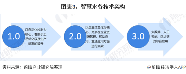 中國(guó)智慧水務(wù)發(fā)展大體可分為三個(gè)階段。水務(wù)自動(dòng)化(1.0)階段,以自動(dòng)化控制為核心,著眼于工藝優(yōu)化以及生產(chǎn)效率的提升;水務(wù)信息化(2.0)階段,以企業(yè)信息化為核心,更多地在企業(yè)資源管理、移動(dòng)應(yīng)用、算法應(yīng)用方面進(jìn)行突破;水務(wù)智慧化(3.0)階段,則是大數(shù)據(jù)、人工智能、區(qū)塊鏈的綜合應(yīng)用。目前,我國(guó)正從信息化階段,邁向智慧化階段。