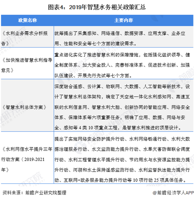 智慧水務(wù)作為智慧城市建設(shè)的重要部分,是我國(guó)戰(zhàn)略層面的重點(diǎn)發(fā)展產(chǎn)業(yè)。為更好的推動(dòng)智慧水務(wù)的發(fā)展,2019年,水利部先后印發(fā)了《水利業(yè)務(wù)需求分析報(bào)告》、《加快推進(jìn)智慧水利指導(dǎo)意見(jiàn)》、《智慧水利總體方案》和《水利網(wǎng)信水平提升三年行動(dòng)方案(2019-2021年》,系統(tǒng)謀劃了水利網(wǎng)信發(fā)展的時(shí)間表、路線圖、任務(wù)書(shū),旨在推動(dòng)水務(wù)工作的信息化進(jìn)程。