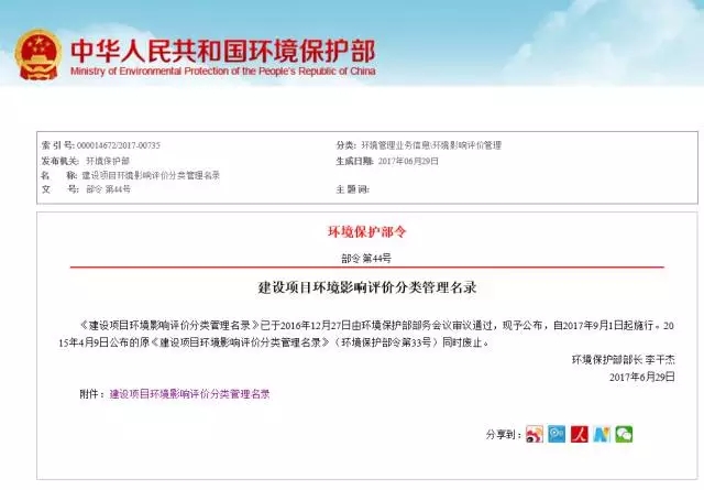 第八條 本名錄自2017年9月1日起施行。2015年4月9日公布的原《建設(shè)項(xiàng)目環(huán)境影響評(píng)價(jià)分類(lèi)管理名錄》(環(huán)境保護(hù)部令第33號(hào))同時(shí)廢止。
