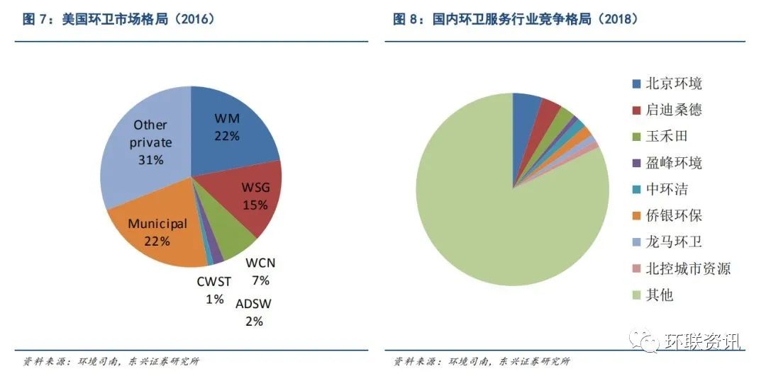 美國的清掃業(yè)務與收集、清運業(yè)務通常由不同公司完成,從事收集、轉運業(yè)務類的公司基本不介入清掃市場業(yè)務。美國三大固廢龍頭 WM、RSG 和 WCN 占據(jù)全美固廢市場 45%份額,這些固廢龍頭業(yè)務以收集轉運為主。而清掃業(yè)務一般有區(qū)域性的小型私營垃圾清掃公司專門從事清掃類業(yè)務,清掃行業(yè)的市場集中度很低。