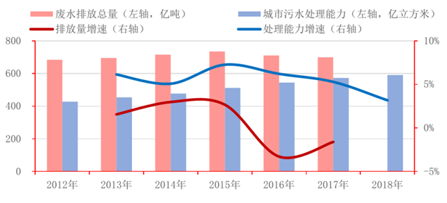而從治理端來看,我國城市污水處理產(chǎn)能常年上漲,至2018年或已達到16200億立方米/日。將我國現(xiàn)有的污水處理產(chǎn)單日處理產(chǎn)能代入全年365天滿功率運行計算,2017年僅城市污水處理能力就可以覆蓋同年全國廢水產(chǎn)生量的82%,這一數(shù)據(jù)較2012年大幅上漲了近20個百分點,足以看出近年來我國污水處理行業(yè)的迅猛發(fā)展。