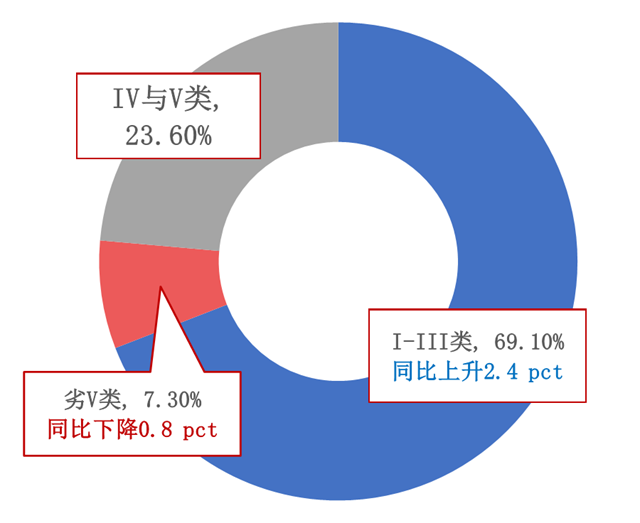 分流域來看,長江、黃河、珠江、松花江、淮河、海河、遼河等七大流域及西北諸河、西南諸河和浙閩片河流I-III類水質(zhì)斷面比例為79.1%,同比上升4.8個百分點;劣V類為3.0%,同比下降3.9個百分點。其中,西北諸河、浙閩片河流、西南諸河和長江流域水質(zhì)為優(yōu);珠江流域水質(zhì)良好;黃河、松花江、淮河、遼河和海河流域為輕度污染。黃河、遼河及海河流域劣V類占比較高。