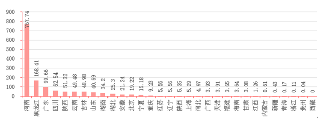 據(jù)各地方部門統(tǒng)計上報,治理初期分布在我國220座城市的2100個黑臭水體中,廣東省所占數(shù)量最多,有243個,其次為安徽、湖南、山東與江蘇;西藏地區(qū)沒有黑臭水體問題上報。但如果按水體面積衡量,河南省黑臭水體面積遠超其他全部省份之和,高達769.74平方公里,為黑臭水體的“重災(zāi)區(qū)”;相比之下,第二名的黑龍江省僅為168.41平方公里。