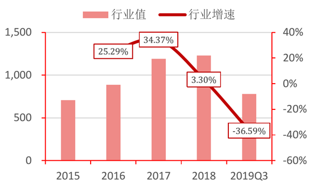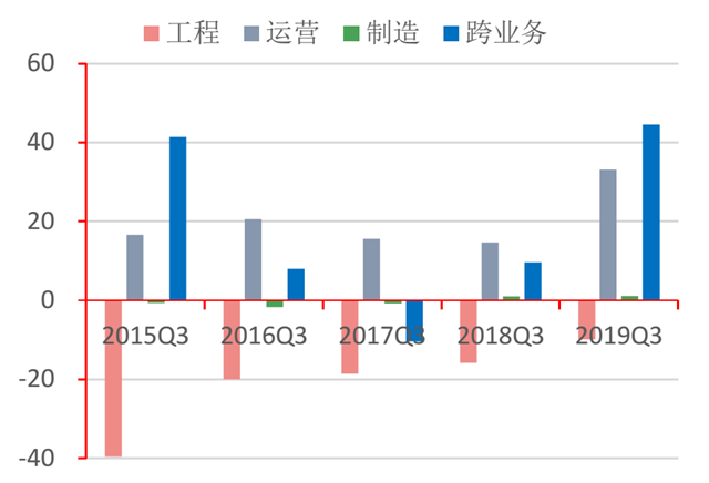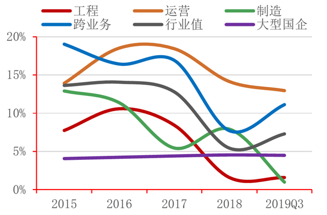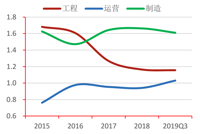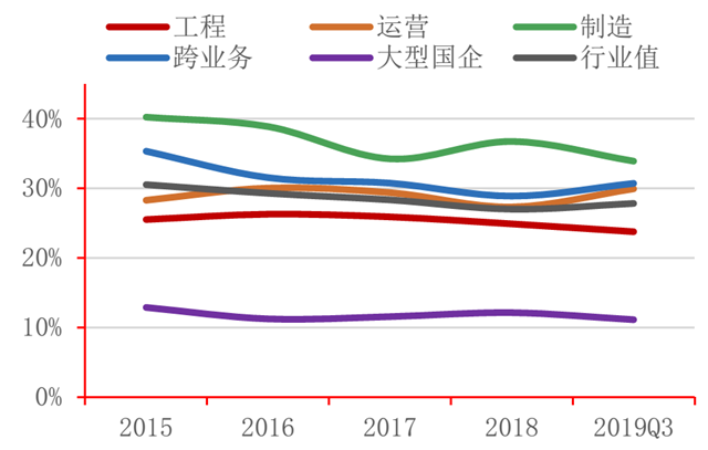 從盈利能力來看,行業(yè)營業(yè)總收入、凈利潤增速呈下降趨勢。其中,營業(yè)收入自2015年以來增速最高達34.37%,2019年第三季度行業(yè)同比下降9.28%,工程、制造類企業(yè)同比下降24.03%、3.75%;凈利潤絕對值在2017年達到152.17億后, 2018年縮減至66.64億。