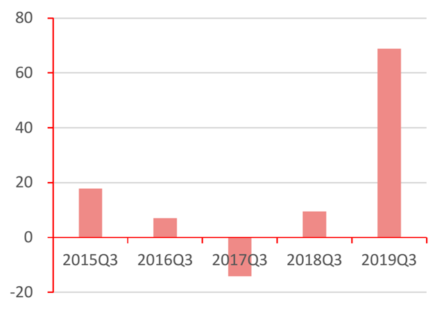 2)受前期舉債擴張規(guī)模影響,2018年諸多公司財務(wù)費用大幅上升,導(dǎo)致凈利率下滑嚴重。運營類企業(yè)2019年第三季度毛利率略有回升,而凈利率降幅較大系管理費用和財務(wù)費用大幅上升所致。