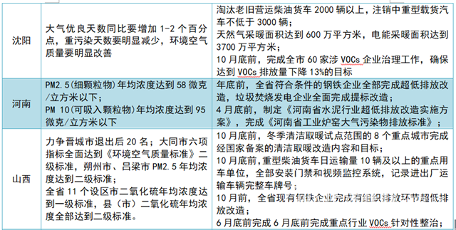 從上表可以看出,各地方在堅持主要路線的情況下,結(jié)合實(shí)際情況,制定了攻堅計劃,尤其是加快了對鋼鐵超低排放、推進(jìn)清潔能源和柴油車治理的進(jìn)程。