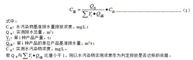 4.2.6水污染物排放濃度限值適用于單位產(chǎn)品實(shí)際排水量不高于單位產(chǎn)品基準(zhǔn)排水量的情況。若單位產(chǎn)品實(shí)際排水量超過(guò)單位產(chǎn)品基準(zhǔn)排水量,應(yīng)按公式(1)將實(shí)測(cè)水污染物濃度換算為水污染物基準(zhǔn)水量排放濃度,并以水污染物基準(zhǔn)水量排放濃度作為判定排放是否達(dá)標(biāo)的依據(jù)。產(chǎn)品產(chǎn)量和排水量統(tǒng)計(jì)周期為一個(gè)工作日。