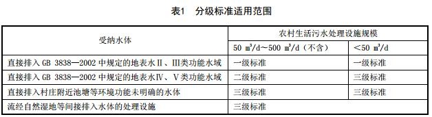 4.1.2 規(guī)模<500 m³/d 的農村生活污水處理設施水污染物排放分為一級標準、二級標準和三級標準,分級標準適用范圍見表1。