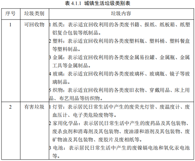4.1.2 確定了分類類別,一方面可用于指導(dǎo)垃圾源頭分類,另一方面可用于指導(dǎo)企業(yè)參與分類收集運營。根據(jù)《生活垃圾分類標志》GB/T19095,生活垃圾分為 4 個大類和 11 個小類。4 個大類分別為可回收物、有害垃圾、廚余垃圾和其他垃圾。其中可回收物又分為紙類、塑料、金屬、玻璃、織物 5 個小類,有害垃圾又分為燈管、家用化學(xué)品、電池 3 個小類,廚余垃圾又分為家庭廚余垃圾、餐廚垃圾、其他廚余垃圾 3 個小類,其他垃圾不分小類。