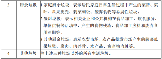 表示易腐爛的、含有機質(zhì)的生活垃圾,包括家庭廚余垃圾、餐廚垃圾和其他廚余垃圾等。
