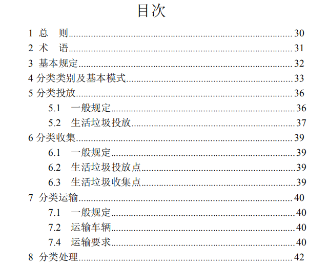 本標準的主要技術(shù)內(nèi)容是:1.總則;2.術(shù)語;3.基本規(guī)定;4.分類類別及基本模式;5.分類投放;6.分類收集;7.分類運輸;8.分類處理。